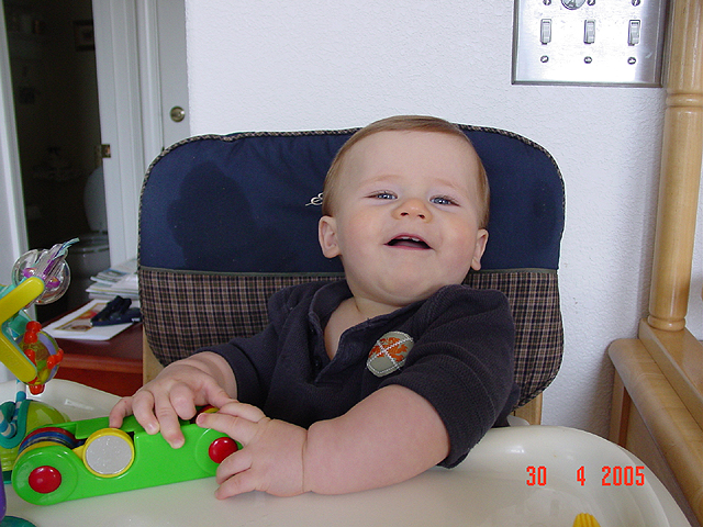 April 30, 2005Hunter shows off his new haircut, his new top teeth, and his new wagon. Click any image for larger view.
