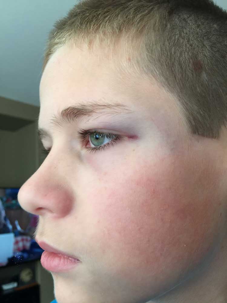 Hunter had a friend over today and they were playing in his room with Ryder. He and Ryder were wrestling while Ryder was holding a multi-use pocket tool he picked up in Hunter's room. He tried to get away from Hunter, and tagged him right by his eye with the tool -- that had a tiny hammer on the end of it! Good thing it missed his eye!