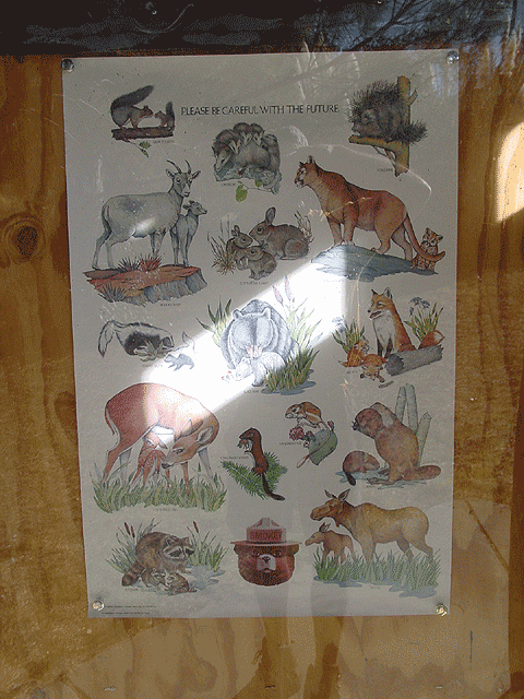 Peacock Peacock in our campsite. Another Peacock in our campsite! Pretty tail feathers. Pretty boy. View from our campsite. Campground signs. Trout sign. Trout Story. Native animals. Native trees and plants. Native fish.