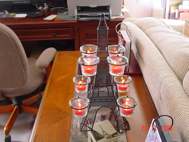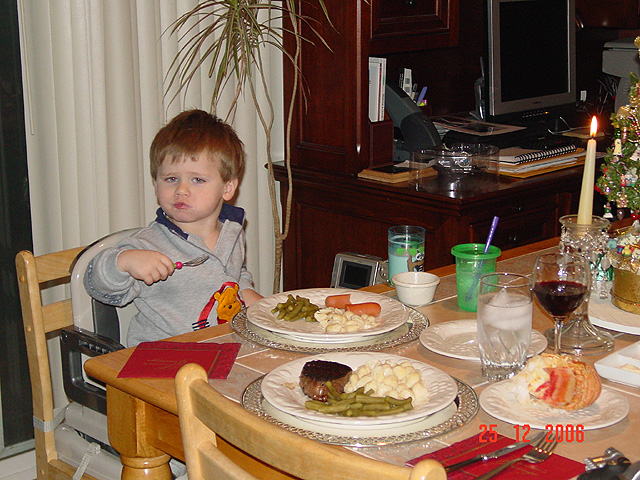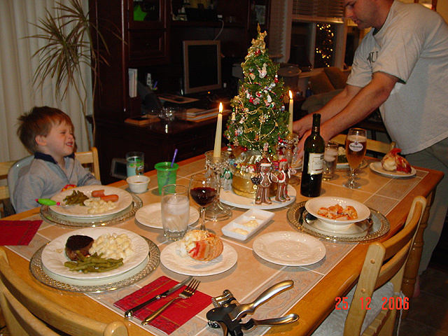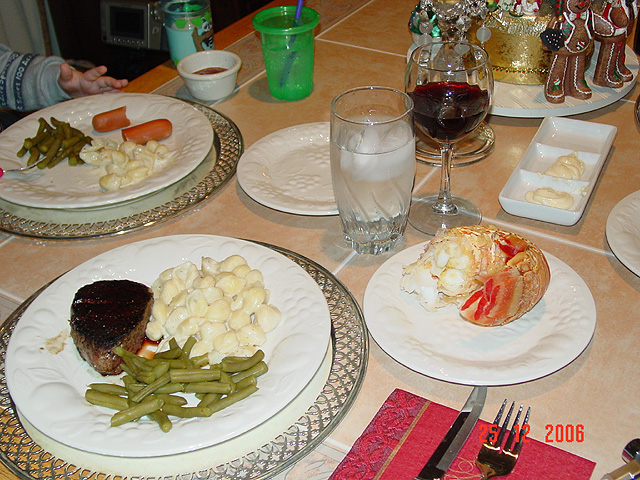 Christmas dinner Filet Mignot and lobster tail Jumbo prawns Hunter having dinner Hunter at the table Hunter at the table Hunter at the table Hunter playing with the wagon again. Ramon the dancing and singing penguin Eiffel Tower votive holder from Natalie Eiffel Tower votive holder from Natalie Eiffel Tower votive holder from Natalie