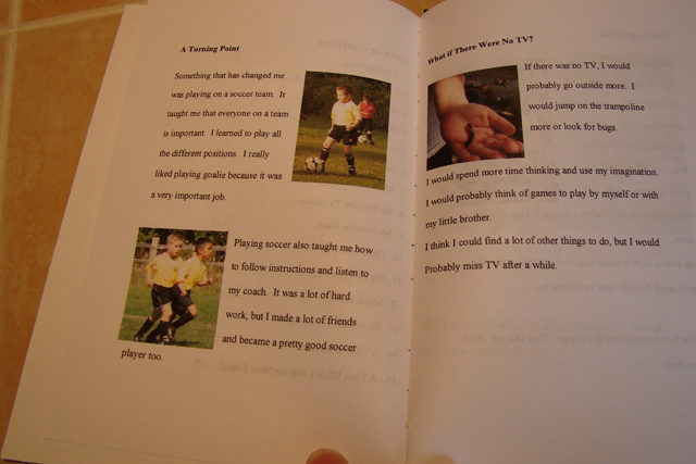 Hunter's class had their book binding day today. Hunter got to "sew" his book himself and bind it. They were also treated to pizza and drinks. He had a fun day and his book looks great!