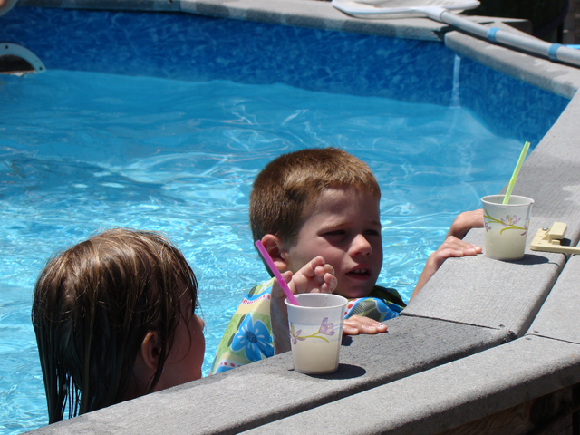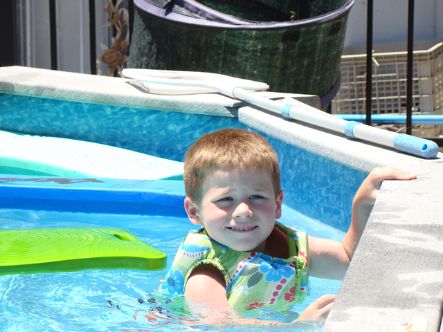 June 28, 2010Hunter swimming with his cousins at grandma's. (He borrowed the flowered life vest from Jordan!) Click any image for larger view.