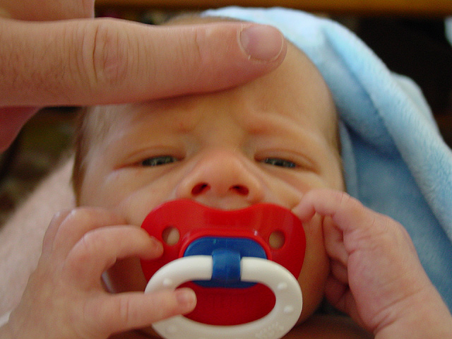 He takes after Dave... Tiny head next to Dave's finger. Size comparison to Dave's hand. Relaxing on Dave's lap. Hunter loves his pacifier. Sleepy smile. Peeking with one eye. Naked baby.