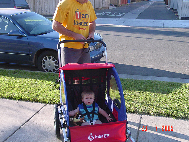 Hunter loves his swimming pool and his new stroller/bike trailer.