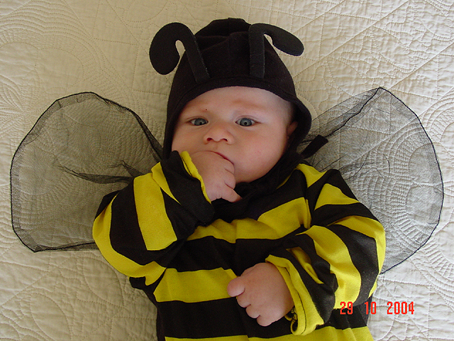 Hunter in his bee costume. Big hands for a bumble bee... Eating his hand... A serious bee. Silly bumble bee. Ready for Halloween!