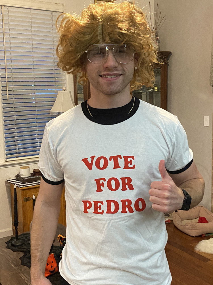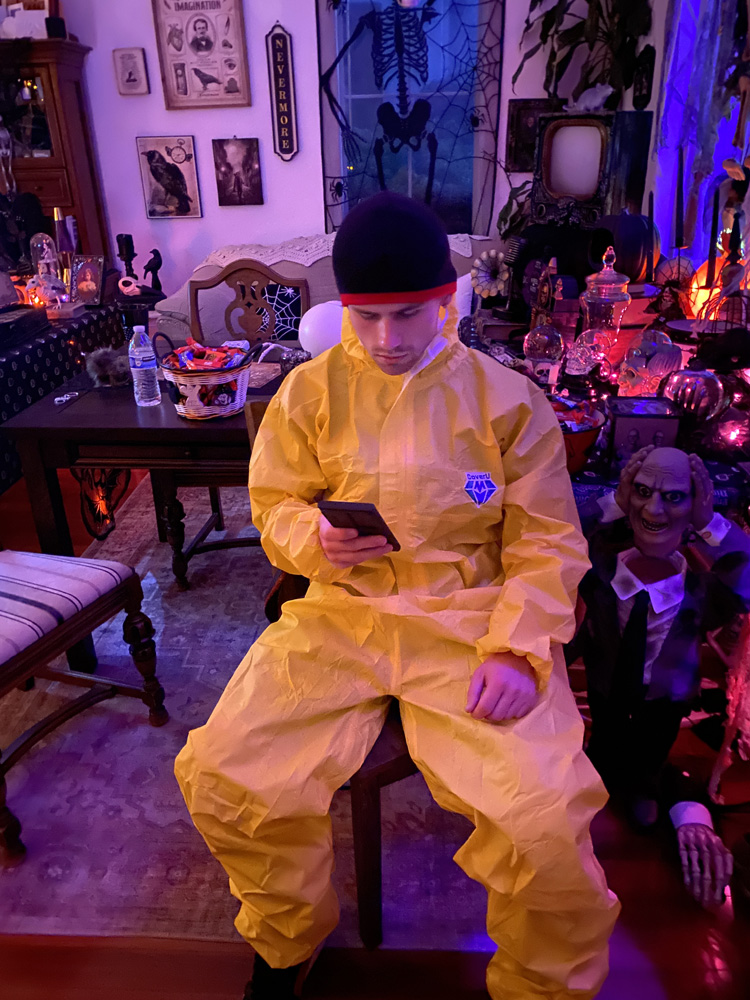 October 31, 2023Hunter tried on Ryder's Napoleon Dynamite costume, but he was Jessie from Breaking Bad for Halloween! Click any image for larger view.