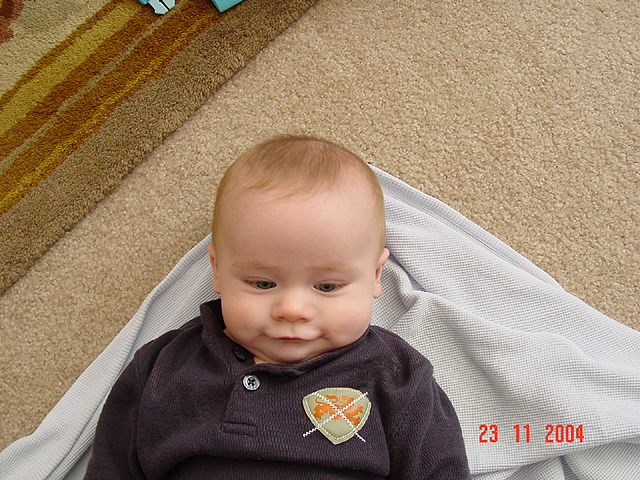 Hunter playing on his belly. Hunter is proud of himself every time he rolls over. Chubby legs! That's a lot of drool... Showing a smile. Hunter being silly. Hunter being silly. Hunter being silly. All that playing has worn him out.