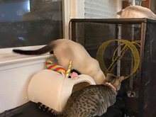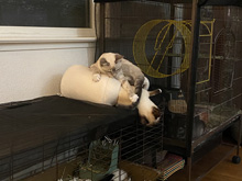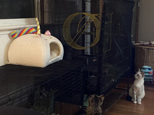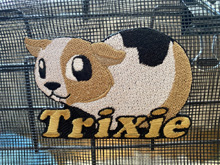 The new kittens are VERY interested in Trixie and Chica. We wanted the small full babies to feel safe, so my mom made them some mesh covers to put on at night or when we are gone so they don't stick their paws in the cages and bug them! She even ordered super cute patches with their names from Etsy.