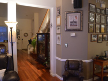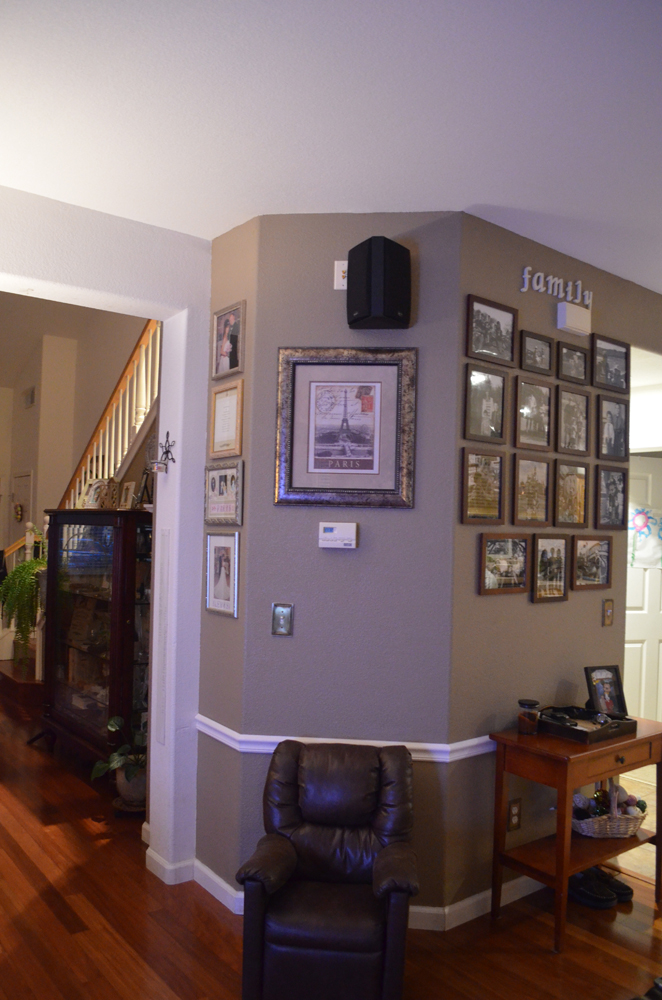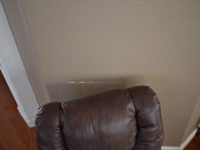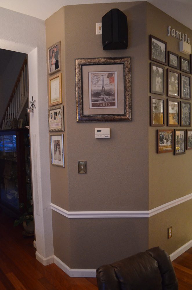 Ryder has a little recliner that has been scraping the paint off of the wall behind it. We also have a small table along this painted wall and the paint gets scraped when the kids slam the drawer shut. We bought a piece of chair rail and Dave put it up today. It looks perfect and will keep the wall from getting banged up!
