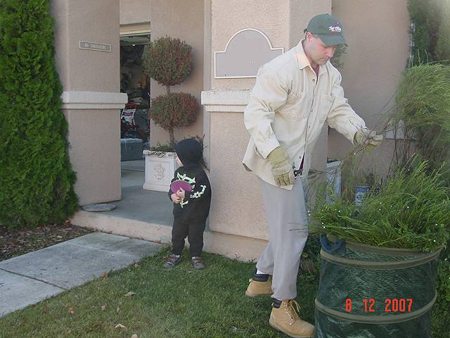 Hunter supervising dad. Dave cuts down the first shrub. Dave working... Hunter Dave and Hunter Hunter Much cleaner!