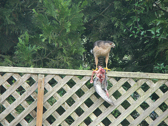 While we were having Ryder's birthday party, we looked out and noticed a hawk sitting on the fence eating a pigeon. Not a pretty site, especially not at a kid's birthday party!