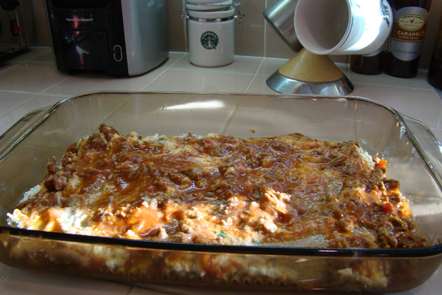 - Spread 1 cup meat sauce onto bottom of 13x9 baking dish.