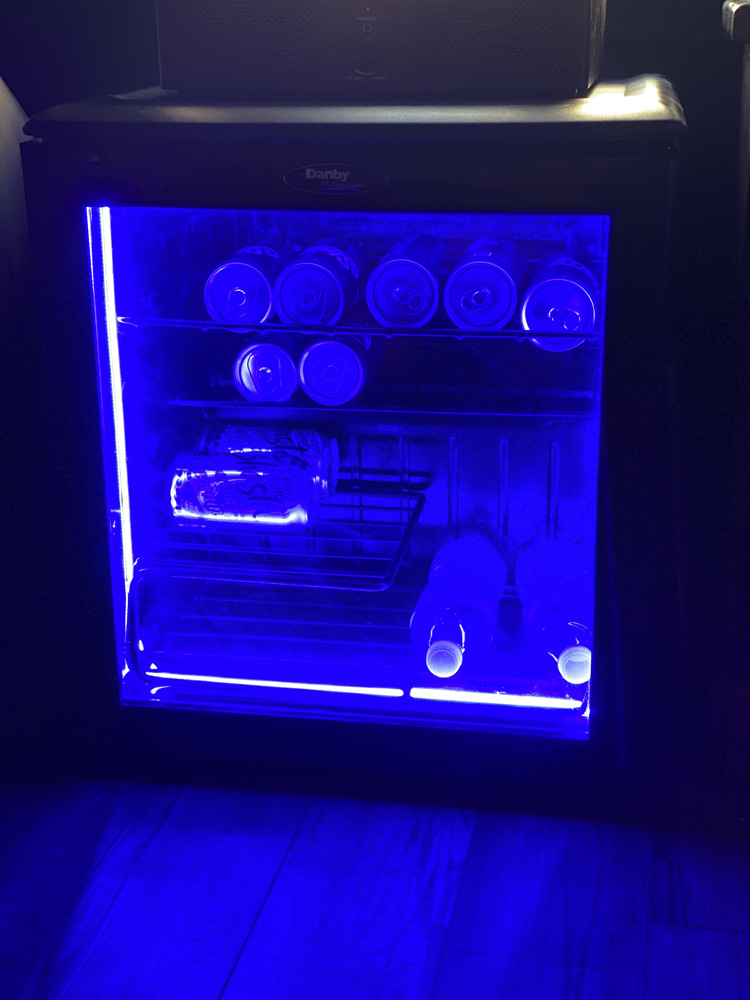 I've seen some glass-front beverage refrigerators that have the blue lighting inside. It looks super cool at night. Ryder has a small mini fridge with a glass door already, so I ordered this COB light strip on Amazon that was rated for outdoor use and is waterproof. I also used one of these strips in white behind his bed when we updated his room last month. They are so easy to stick on, and it is a pretty cool transformation!