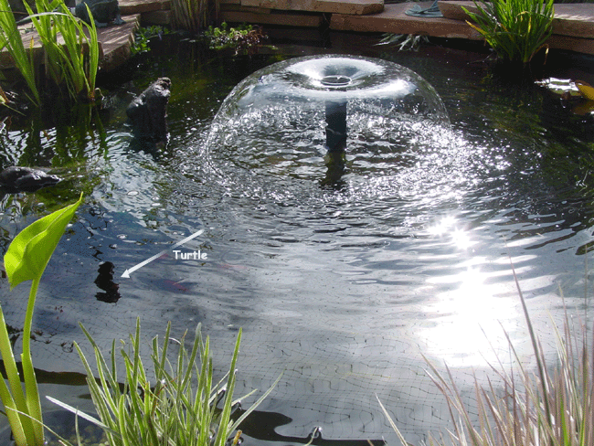 Sparkling water... The pond is coming alive for Spring... Can you spot the turtle? Pond from behind... Our Japanese Maple is growing! Iceplant Rock planted with flowers. A big bullfrog.