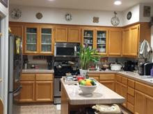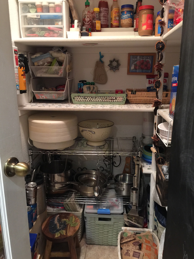 I read a blog post about things that date your home (silly, I know) and pot racks were one of them. We've had this pot rack for ages and it's always been a stretch for me to hang the pots and get them down. Decided to get one of the metal shelving units similar to what you see in the cooking shows. We got one to fit in the pantry and it is so much nicer having the main pots and pans easier to grab. Now we have an open ceiling to hang pendant lights!