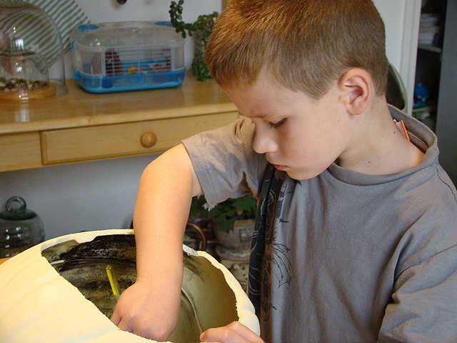 October 21, 2010Hunter and mom's pumpkin. We used a carvable foam pumpkin to make this Halloween pumpkin display. Click any image for larger view.