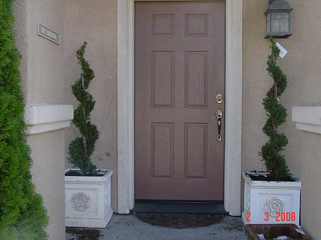 Our "pom-pom" trees at the front entry had seen better days. They water line to them broke, so they became rather dry before we noticed it. They were hard to manage and a little big for our entry, because they blocked our doorbell. We thought it was time to replace them with the trees we wanted in the first place.