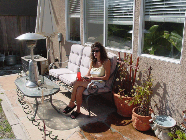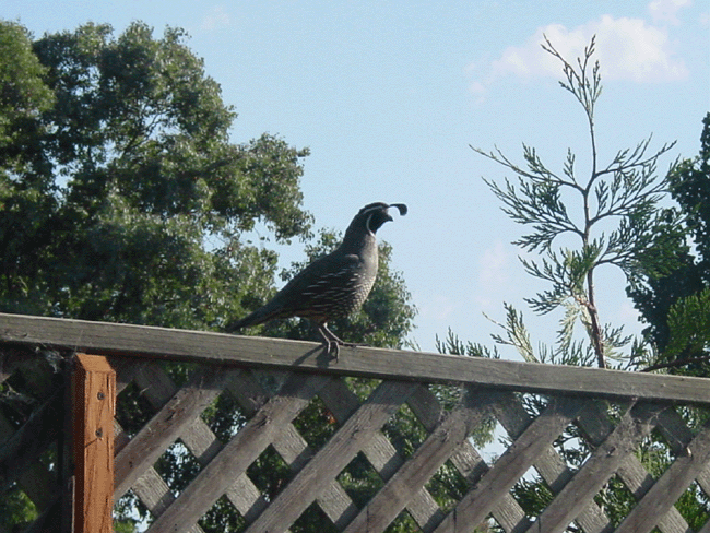 Friendly neighborhood quail. Red roses Artichoke bloom. Artichoke bloom. Heidi relaxing by the pond. Orange flowers. Scary spider in our vegetable gardens.