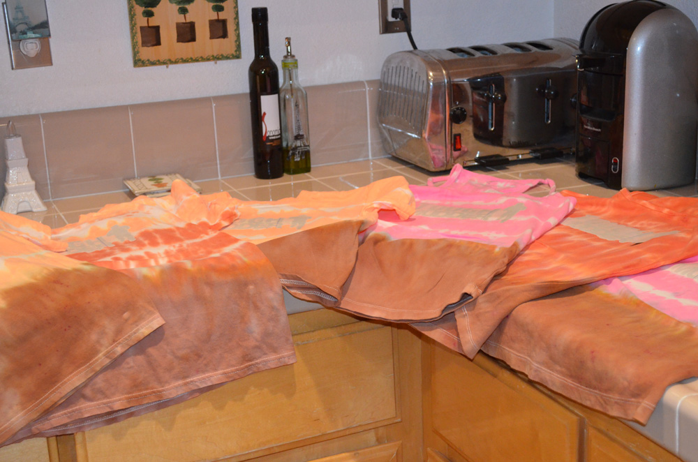 My friend did step one: tie-dying the top portion of the shirts. After the shirts were washed and dried, I used brown Tulip tie-dye on the bottom part of the shirts to give the impression of mud (Since this is a mud race). After that was washed and dried, I did the transfers. I always use iron-on transfer paper that works great. You print the design on a deskjet, then iron it on.